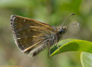 This morning we had a club dig on pasture, but nothing was found so I left to do my weekly transect at Mill Hill as it was a sunny day. There was a wind at the start and I was surprised to find a Grizzled Skipper at the top of the hill. Beside the path near the bottom of the hill I found a black adder. At the bottom there was another Grizzled skipper, a Green-veined White, a Peacock, a Small Heath, Speckled Wood and many Dingy Skippers, fighting and nectaring. Just below the car park I found a Small Copper, my first of the year. I tried my new camera, a Panasonic Lumix FZ45 with close-up lens, on the Dingy Skippers and am very satisfied with the results. I am getting depth of field, clarity of detail and colour vibrancy that I cannot achieve with my other cameras.